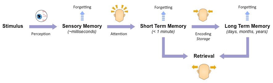 Memory is the faculty of the mind by which data or information is encoded, stored, and retrieved when needed. It is the retention of information over time for the purpose of influencing future action. If past events could not be remembered, it would be impossible for language, relationships, or personal identity to develop. Memory is often understood as an informational processing system with explicit and implicit functioning that is made up of a sensory processor, short-term (or working) memory, and long-term memory. This can be related to the neuron. The sensory processor allows information from the outside world to be sensed in the form of chemical and physical stimuli and attended to various levels of focus and intent.