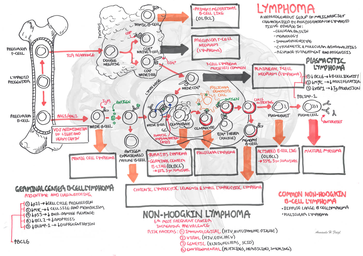 Non-Hodgkin lymphoma (also known as non-Hodgkin’s lymphoma, NHL, or sometimes just lymphoma) is a cancer that starts in white blood cells called lymphocytes, which are part of the body’s immune system. Hodgkin lymphoma has a particular appearance under the microscope and contains cells called Reed-Sternberg cells. NHL looks different under the microscope and does not contain Reed-Sternberg cells.