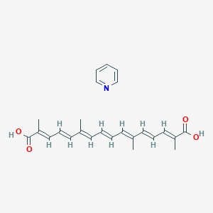 The synthesis of pyridine; (2E,4E,6E,8E,10E,12E,14E)-2,6,11,15-tetramethylhexadeca-2,4,6,8,10,12,14-heptaenedioic acid involves multiple steps, including the formation of the pyridine ring and the introduction of the conjugated heptaenedioic acid chain. The reaction conditions typically require the use of strong acids or bases, high temperatures, and specific catalysts to facilitate the formation of the desired product.