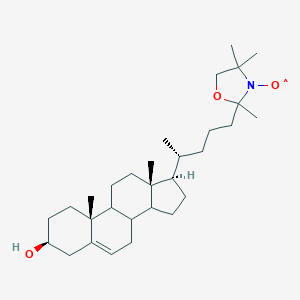 This compound (also termed 25-doxyl-27-nor-cholesterol or CNO) was first synthesized to address the need for a cholesterol analog that could report on molecular behavior without disrupting native membrane interactions. Traditional cholesterol studies faced limitations due to its non-polar structure, which hindered direct observation via spectroscopic methods. The incorporation of a doxyl group at position 25 provided a stable nitroxide radical detectable by EPR, enabling real-time monitoring of cholesterol dynamics. Early work demonstrated that CNO mimics cholesterol’s orientation in lipid bilayers, with the doxyl group buried within the hydrophobic core. This fidelity allowed researchers to study cholesterol’s interactions with proteins and lipids in unprecedented detail, particularly in erythrocyte membranes and model lipid systems.