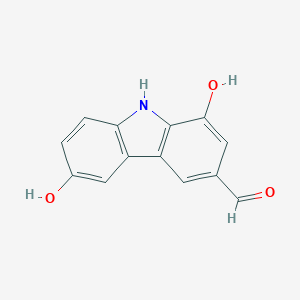 Functional Group Manipulations: Subsequent steps involve the introduction or modification of functional groups on the carbazole core to yield the final structure of this compound. This may include formylation and demethylation/hydroxylation reactions.