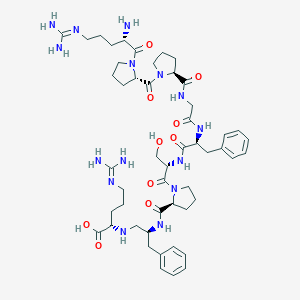 The structure of Bradykinin, phe(8)-psi-CH2NH-arg(9)- features a unique psi(CH2NH) bond between the phenylalanine (Phe) at position 8 and arginine (Arg) at position 9. This modification enhances the compound's resistance to enzymatic degradation, making it a more potent and longer-lasting analog compared to natural bradykinin. The synthesis typically involves solid-phase peptide synthesis (SPPS), which allows for precise control over the peptide sequence and modifications .