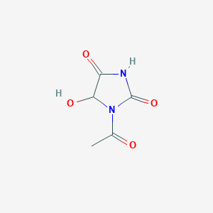 2,4-Imidazolidinedione, 1-acetyl-5-hydroxy-(9CI) is a compound that has garnered interest in the fields of medicinal chemistry and pharmacology due to its potential biological activities. Characterized by its molecular formula and a molecular weight of 158.11 g/mol, this compound features both acetyl and hydroxy functional groups, which enhance its reactivity and versatility in various applications.