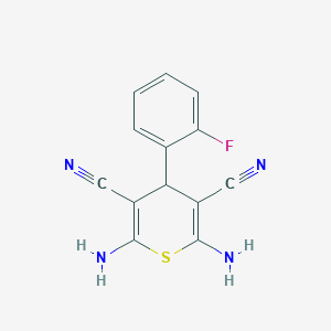 The mechanism of action of 2,6-diamino-4-(2-fluorophenyl)-4H-thiopyran-3,5-dicarbonitrile involves its interaction with specific molecular targets, such as enzymes or receptors. The compound’s structure allows it to bind to these targets, modulating their activity and leading to various biological effects. The exact pathways involved depend on the specific application and target .