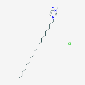 This compound, also known as 1-Octadecyl-3-methylimidazolium chloride, is a cationic surfactant and an ionic liquid. Its structure consists of an imidazolium ring substituted with a methyl group and a long C18 alkyl (octadecyl) chain. This amphiphilic nature, with a hydrophilic imidazolium head and a hydrophobic alkyl tail, governs its physicochemical properties and applications.