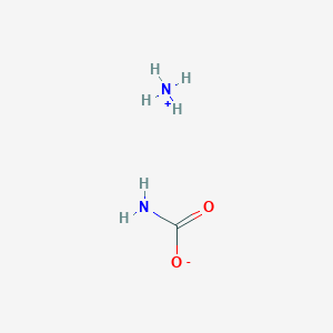 Ammonium carbamate ([NH₄][H₂NCO₂]) is a white, crystalline solid compound that plays a pivotal role as a key intermediate in the industrial synthesis of urea, one of the world's most important nitrogen-based fertilizers.[1][2] It is formed through the direct reaction of ammonia (NH₃) and carbon dioxide (CO₂).[1] The compound is highly soluble in water and less so in alcohol, and it exhibits a characteristic ammonia-like odor.[3][4] Under ambient conditions, this compound is unstable and slowly decomposes back into gaseous ammonia and carbon dioxide.[1][5] This reversible nature is central to its industrial application. Beyond its role in fertilizer production, this compound is also used as an ammoniating agent in chemical manufacturing, a buffering agent in cosmetics, and has been approved as an inert ingredient in certain pesticide formulations.[3][5]