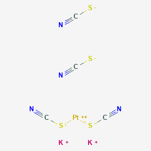 Dipotassium platinum(2+) tetrathiocyanate (K₂[Pt(SCN)₄]) is a platinum(II) coordination complex with four thiocyanate (SCN⁻) ligands and two potassium counterions. The thiocyanate ligand, a pseudohalide, binds to platinum via its sulfur atom (S-bonded mode), influencing the compound’s solubility, stability, and reactivity compared to other platinum complexes with hard ligands like chloride or ammonia .