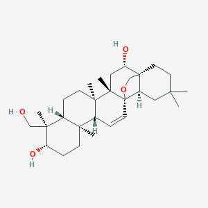 Saikogenin F (SGF) is an oleanane-type triterpenoid sapogenin derived from saikosaponins, primarily found in Bupleurum falcatum L. (Chinese thorowax root). It is generated via enzymatic hydrolysis of saikosaponin A (SSA) or D (SSD) by β-glucosidases such as BglPm or BglLk, which cleave the glucose moiety at the C3 position . Structurally, SGF retains the core aglycone framework of saikosaponins but lacks sugar substituents, contributing to its distinct pharmacological profile. Key features include a 13,28-epoxy ring and hydroxyl groups at C3 and C16, which are critical for its bioactivity .