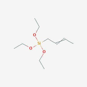 [(E)-But-2-enyl]-triethoxysilane is an organosilane compound characterized by a trans-configured butenyl group (C=C bond at position 2) attached to a triethoxysilane moiety. This structure imparts unique reactivity due to the electron-rich alkene and hydrolyzable ethoxy groups. It is primarily used as a precursor in sol-gel processes to synthesize functionalized silica hybrids, surface modifiers, and nanocomposites . The E-configuration ensures steric and electronic specificity, influencing its condensation behavior and compatibility with polymers or inorganic matrices.