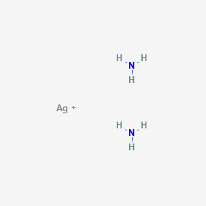The diamminesilver(I) cation consists of a central silver ion (Ag⁺) in a +1 oxidation state coordinated to two ammonia (NH₃) molecules.[1] The silver(I) ion has a d¹⁰ electronic configuration, which favors a linear coordination geometry due to sp hybridization.[1] This results in a nearly linear [H₃N-Ag-NH₃]⁺ structure with an N-Ag-N bond angle approaching 180°.[1] X-ray diffraction studies confirm this geometry, with Ag-N bond lengths typically falling in the range of 2.1 to 2.3 Å, the exact value depending on the counter-anion and crystal packing forces.[1] The molecular weight of the standalone cation is approximately 141.930 g/mol .[1][3]