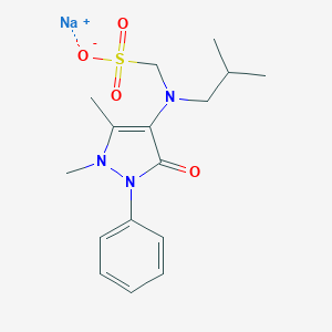 The synthesis of this compound begins with the assembly of its heterocyclic pyridine core, functionalized with a sulfonic acid group and an amine side chain. As reported by EvitaChem, the process involves sequential condensation, sulfonation, and neutralization steps. The molecular structure (SMILES: CC1=C(C(=O)N(N1C)C2=CC=CC=C2)N(CC(C)C)CS(=O)(=O)[O-].[Na+]) is constructed through: