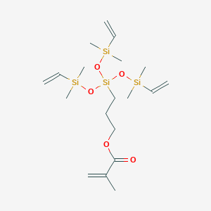 3-(3-((Dimethyl(vinyl)silyl)oxy)-1,1,5,5-tetramethyl-1,5-divinyltrisiloxan-3-yl)propyl methacrylate plays a significant role in biochemical reactions, particularly in the formation of hybrid organic-inorganic materials. This compound interacts with various enzymes, proteins, and other biomolecules through its methacrylate and silane groups. The methacrylate group can participate in polymerization reactions, forming covalent bonds with other monomers, while the silane group can form stable siloxane bonds with inorganic substrates. These interactions enhance the mechanical properties and stability of the resulting materials, making them suitable for use in biomedical and industrial applications.