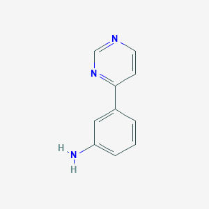 3-(Pyrimidin-4-yl)aniline is a phenylpyrimidine derivative consisting of an aniline moiety (a benzene ring with an amino group) linked to a pyrimidine heterocycle at the meta position (C3 of the benzene and C4 of the pyrimidine). This scaffold is a versatile intermediate in medicinal chemistry, particularly in the synthesis of kinase inhibitors and other bioactive molecules. Derivatives of this core structure are frequently modified with halogen, alkyl, or electron-withdrawing substituents to optimize physicochemical and biological properties.