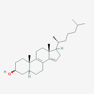 The biosynthesis of cholesterol from lanosterol is a complex process involving a series of enzymatic reactions that modify the sterol nucleus and side chain. This pathway can proceed through two major routes, often referred to as the Bloch and the Kandutsch-Russell pathways, which differ primarily in the timing of the reduction of the double bond in the sterol side chain. 5α-Cholesta-8,14-dien-3β-ol is an intermediate in this intricate network.