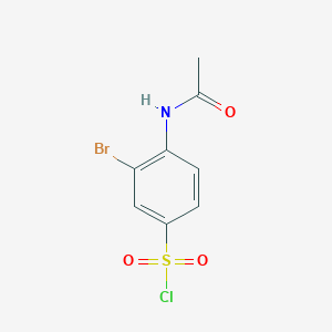 4-Acetamido-3-bromobenzene-1-sulfonyl chloride is a halogenated aromatic sulfonyl chloride derivative with the molecular formula C₈H₇BrClNO₃S (molecular weight: 336.57 g/mol). Its structure features a sulfonyl chloride group (-SO₂Cl) at position 1, a bromine atom at position 3, and an acetamido group (-NHCOCH₃) at position 4 on the benzene ring. These functional groups confer unique reactivity: the sulfonyl chloride enables nucleophilic substitutions (e.g., forming sulfonamides), the bromine atom allows further halogenation or cross-coupling reactions, and the acetamido group enhances solubility in polar solvents and may influence biological interactions.