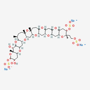 this compound’s synthesis is hindered by its complex polyether ladder structure, which includes fused cyclic ethers (AB, EF, and IJ rings) and multiple stereochemical centers. The C3 angular methyl group and C23 stereocenter introduce steric and electronic challenges during ring-closing reactions. Methodological approaches to address these include glycal-epoxide rearrangements and allyl Grignard-induced epoxide cyclization to achieve stereoselectivity .