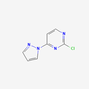 The mechanism of action of 2-chloro-4-(1H-pyrazol-1-yl)pyrimidine involves its interaction with specific molecular targets, such as enzymes or receptors. The compound can inhibit or activate these targets, leading to various biological effects. The exact pathways and targets depend on the specific application and the biological system being studied .