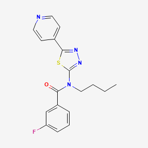 N-Butyl-3-fluoro-N-(5-(pyridin-4-yl)-1,3,4-thiadiazol-2-yl)benzamide is a structurally complex small molecule featuring a 1,3,4-thiadiazole core linked to a pyridinyl group and a fluorinated benzamide moiety. The presence of a fluorine atom at the 3-position of the benzamide ring enhances its metabolic stability and bioavailability, while the N-butyl chain may contribute to improved lipophilicity and membrane permeability . The pyridin-4-yl substituent on the thiadiazole ring introduces hydrogen-bonding capabilities, which are critical for target engagement in biological systems.