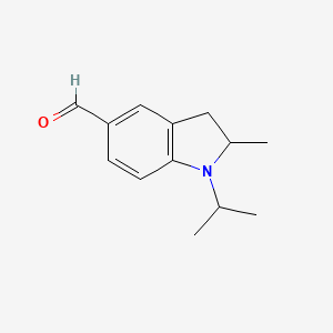 1-Isopropyl-2-methyl-2,3-dihydro-1H-indole-5-carbaldehyde is a nitrogen-containing heterocyclic compound belonging to the indole family, characterized by its unique structural features, including an isopropyl group and a carbaldehyde functional group. This compound has garnered interest in medicinal chemistry due to its potential biological activities, including antimicrobial, anticancer, and antiviral properties.