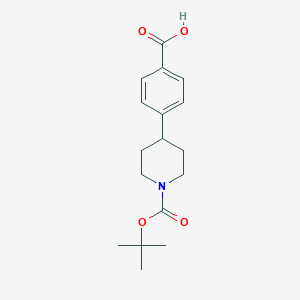 This compound is a white to off-white solid. Its chemical structure features a benzoic acid moiety connected to a piperidine ring at the 4-position, with the piperidine nitrogen protected by a tert-butoxycarbonyl (Boc) group. This protecting group is stable under many reaction conditions but can be readily removed under acidic conditions, allowing for further chemical modification.