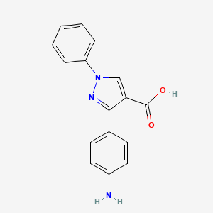 The mechanism of action of 3-(4-aminophenyl)-1-phenyl-1H-pyrazole-4-carboxylic acid involves its interaction with specific molecular targets, such as enzymes or receptors. The aminophenyl group can form hydrogen bonds and electrostatic interactions with the active sites of enzymes, leading to inhibition of enzyme activity. The carboxylic acid group can also participate in hydrogen bonding and ionic interactions, further stabilizing the compound’s binding to its target. These interactions can disrupt normal biochemical pathways, leading to the desired therapeutic or biochemical effects.