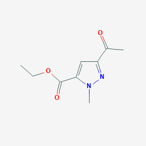 The mechanism of action of ethyl 3-acetyl-1-methyl-1H-pyrazole-5-carboxylate involves its interaction with specific molecular targets. For instance, it may inhibit certain enzymes by binding to their active sites, thereby blocking their activity. The compound’s structure allows it to form hydrogen bonds and hydrophobic interactions with target proteins, leading to its biological effects .