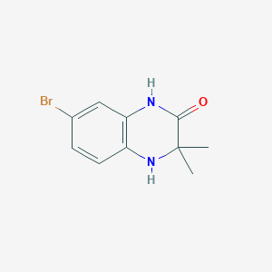 The mechanism of action of 7-Bromo-3,3-dimethyl-1,2,3,4-tetrahydroquinoxalin-2-one is not fully understood. it is believed to exert its effects by interacting with specific molecular targets and pathways. For instance, it may inhibit certain enzymes or receptors involved in biological processes, leading to its observed biological activities . Further research is needed to elucidate the exact molecular mechanisms and pathways involved.
