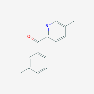 2-(3-Methylbenzoyl)-5-methylpyridine is a pyridine derivative featuring a methyl group at the 5-position of the pyridine ring and a 3-methylbenzoyl substituent at the 2-position. The molecular formula is inferred as C₁₄H₁₃NO (molecular weight: 211.27 g/mol), consistent with positional isomers such as 2-(4-methylbenzoyl)-5-methylpyridine . The 3-methylbenzoyl group introduces steric and electronic effects distinct from para-substituted analogs, which may influence solubility, reactivity, and biological activity. Pyridine derivatives are widely studied in medicinal chemistry, particularly as enzyme inhibitors or receptor modulators .