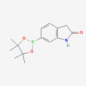 6-(4,4,5,5-Tetramethyl-1,3,2-dioxaborolan-2-yl)indolin-2-one is a boronate ester derivative of indolin-2-one, a heterocyclic scaffold widely utilized in medicinal chemistry and materials science. The compound features a pinacol boronate group at the 6-position of the indolin-2-one core (CAS: 893441-85-5) . Its molecular formula is C₁₄H₁₈BNO₃ (average mass: 259.114 Da), and it serves as a key intermediate in Suzuki-Miyaura cross-coupling reactions for synthesizing biaryl or heteroaryl derivatives . The boronate group enhances reactivity in palladium-catalyzed couplings, making it valuable for drug discovery and polymer synthesis .