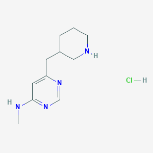 Methyl-(6-piperidin-3-ylmethyl-pyrimidin-4-yl)-amine hydrochloride features a pyrimidine core substituted at the 4-position with a methylamine group and at the 6-position with a piperidin-3-ylmethyl moiety (Figure 1). The molecular formula is C₁₁H₂₀Cl₂N₄ , with a molar mass of 279.21 g/mol. The piperidine ring adopts a chair conformation, minimizing steric strain, while the pyrimidine ring maintains planar geometry due to aromatic stabilization.