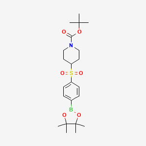 tert-Butyl 4-(4-(4,4,5,5-tetramethyl-1,3,2-dioxaborolan-2-yl)phenylsulfonyl)piperidine-1-carboxylate is a synthetic compound with notable biological activity. Its structure incorporates a boron-containing dioxaborolane moiety, which is known for its unique chemical properties and potential applications in medicinal chemistry. This article aims to explore the biological activities associated with this compound through case studies and research findings.