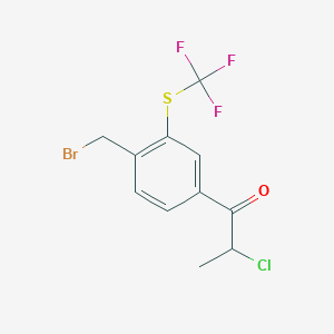 The mechanism of action of 1-(4-(Bromomethyl)-3-(trifluoromethylthio)phenyl)-2-chloropropan-1-one involves its interaction with specific molecular targets, such as enzymes or receptors. The trifluoromethylthio group can enhance the compound’s binding affinity to these targets, while the bromomethyl and chloropropanone groups can participate in covalent modifications of the target molecules. These interactions can modulate the activity of the target proteins, leading to various biological effects.