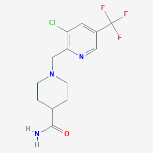 1-(3-Chloro-5-trifluoromethyl-pyridin-2-ylmethyl)-piperidine-4-carboxylic acid amide, with the molecular formula and a molecular weight of 335.75 g/mol, is a compound of significant interest in medicinal chemistry due to its potential biological activities. The presence of a trifluoromethyl group and a piperidine moiety suggests diverse pharmacological properties, including potential applications in cancer therapy and as a modulator of various biological pathways.