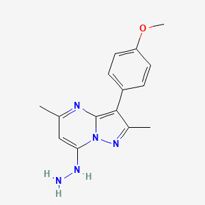 7-Hydrazino-3-(4-methoxyphenyl)-2,5-dimethylpyrazolo[1,5-a]pyrimidine is a heterocyclic compound belonging to the pyrazolo[1,5-a]pyrimidine family. This class of compounds has garnered significant attention in medicinal chemistry due to their diverse biological activities, including anticancer, antiviral, and antimicrobial properties. The unique structural features of this compound enhance its reactivity and potential therapeutic applications.