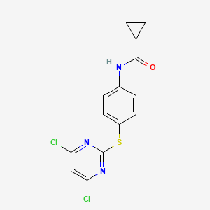 N-(4-((4,6-Dichloropyrimidin-2-yl)thio)phenyl)cyclopropanecarboxamide is a compound of interest in medicinal chemistry due to its potential therapeutic applications. This article explores its biological activity, including mechanisms of action, pharmacological effects, and relevant case studies.