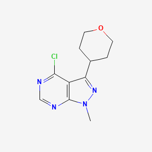 4-Chloro-1-methyl-3-tetrahydro-2H-pyran-4-yl-1H-pyrazolo[3,4-d]pyrimidine is a heterocyclic compound featuring a pyrazolo[3,4-d]pyrimidine core substituted with a chlorine atom at position 4, a methyl group at position 1, and a tetrahydro-2H-pyran-4-yl group at position 3 (Figure 1). This scaffold is structurally analogous to purines, enabling interactions with biological targets such as kinases and receptors . The chlorine atom at position 4 enhances reactivity for further functionalization, while the tetrahydro-2H-pyran-4-yl group contributes to improved metabolic stability and solubility compared to aromatic substituents .