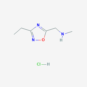 [(3-Ethyl-1,2,4-oxadiazol-5-yl)methyl]methylamine hydrochloride plays a significant role in various biochemical reactions. It interacts with several enzymes, proteins, and other biomolecules. For instance, the compound has been shown to inhibit certain enzymes involved in bacterial cell wall synthesis, making it a potential antibacterial agent. Additionally, it can form hydrogen bonds with proteins, influencing their structure and function. These interactions highlight the compound’s potential as a therapeutic agent.