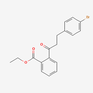 3-(4-Bromophenyl)-2'-carboethoxypropiophenone is a synthetic organic compound featuring a propiophenone backbone substituted with a 4-bromophenyl group at the 3-position and a carboethoxy (ethyl carboxy) moiety at the 2'-position. This structure combines aromatic, ketonic, and ester functionalities, making it a versatile intermediate in pharmaceutical and materials chemistry. Its synthesis typically involves Friedel-Crafts acylation or esterification reactions, with crystallographic methods (e.g., SHELX programs ) often employed for structural validation.