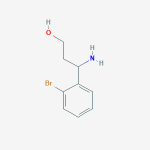 3-Amino-3-(2-bromophenyl)propan-1-ol is a brominated β-amino alcohol with the molecular formula $$ \text{C}9\text{H}{12}\text{BrNO} $$ and a molecular weight of 230.1 g/mol. Its structure features a central carbon atom bonded to an amino group ($$-\text{NH}_2$$), a hydroxyl group ($$-\text{OH}$$), and a 2-bromophenyl substituent, rendering it chiral due to the presence of a stereogenic center. This chirality enables the existence of enantiomers, such as the $$(3R)$$- and $$(3S)$$-configurations, which are critical in asymmetric synthesis and pharmaceutical applications.