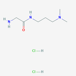 The compound’s molecular structure consists of a central acetamide backbone (CH3CONH-) linked to a 3-(dimethylamino)propyl chain (-CH2CH2CH2N(CH3)2) and an amino group (-NH2) at the 2-position. Two hydrochloride counterions (Cl⁻) neutralize the protonated amine groups. While no direct crystallographic data exists for this specific dihydrochloride salt in the provided sources, its structural features suggest potential hydrogen-bonding interactions and ionic contacts in the crystalline state.