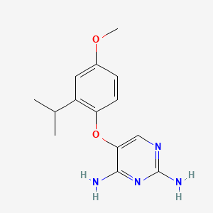 The compound belongs to the diaminopyrimidine class, with a pyrimidine ring substituted at position 5 by a phenoxy group. The phenoxy moiety itself is substituted with a methoxy group at position 4 and an isopropyl group at position 2. The presence of two amine groups at positions 2 and 4 of the pyrimidine ring confers potential hydrogen-bonding capacity, influencing its physicochemical properties.