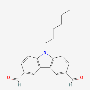 The synthesis of this compound is typically achieved through a two-step process: first, the alkylation of the carbazole nitrogen with a hexyl group, followed by a Vilsmeier-Haack reaction to introduce the aldehyde groups at the electron-rich 3 and 6 positions.