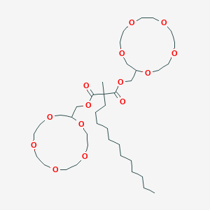 The mechanism by which Bis((1,4,7,10,13-pentaoxacyclopentadecan-2-yl)methyl) 2-dodecyl-2-methylmalonate exerts its effects is primarily through its ability to form stable complexes with various molecules. The ether linkages and malonate ester groups provide multiple binding sites, allowing the compound to interact with different molecular targets. These interactions can modulate the activity of enzymes, receptors, and other proteins, influencing various biochemical pathways.