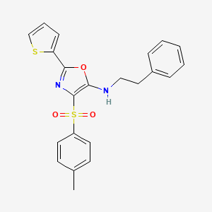 InChI=1S/C22H20N2O3S2/c1-16-9-11-18(12-10-16)29(25,26)22-21(23-14-13-17-6-3-2-4-7-17)27-20(24-22)19-8-5-15-28-19/h2-12,15,23H,13-14H2,1H3 |