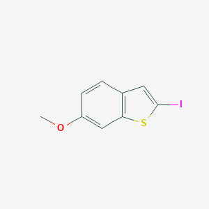 Benzo[b]thiophene, 2-iodo-6-methoxy-, with the CAS Number 183133-27-7, is a halogenated heterocyclic compound that serves as a crucial intermediate in organic synthesis. Its structure, featuring a benzothiophene core with a strategically placed iodine atom and a methoxy group, makes it a valuable building block for the synthesis of more complex molecules, particularly in the realm of medicinal chemistry and materials science. The presence of the iodo group at the 2-position allows for a variety of cross-coupling reactions, enabling the introduction of diverse functionalities, while the methoxy group at the 6-position can influence the electronic properties and metabolic stability of derivative compounds. This guide provides a comprehensive overview of its chemical properties, a detailed synthesis protocol, and its applications in research and development.