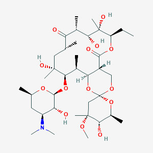 This compound is structurally analogous to Erythromycin A, featuring a 14-membered lactone ring, a desosamine (B1220255) sugar, and a cladinose (B132029) sugar. The primary distinction lies in the modification of the aglycone. The molecular formula of this compound has been determined through high-resolution mass spectrometry.