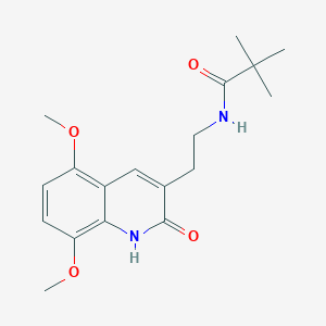 N-(2-(5,8-dimethoxy-2-oxo-1,2-dihydroquinolin-3-yl)ethyl)pivalamide is a synthetic organic compound belonging to the quinoline family. This compound is characterized by its unique structure, which includes a quinoline core substituted with dimethoxy groups and an ethyl pivalamide side chain.