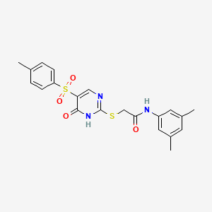 The mechanism of action of N-(3,5-dimethylphenyl)-2-{[5-(4-methylbenzenesulfonyl)-6-oxo-1,6-dihydropyrimidin-2-yl]sulfanyl}acetamide involves its interaction with specific molecular targets, such as enzymes or receptors. The compound may inhibit enzyme activity by binding to the active site or alter receptor function by interacting with binding sites. These interactions can modulate various biochemical pathways, leading to the observed effects.