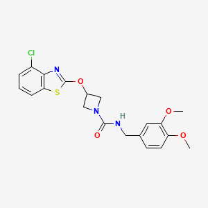 The compound 3-[(4-chloro-1,3-benzothiazol-2-yl)oxy]-N-[(3,4-dimethoxyphenyl)methyl]azetidine-1-carboxamide is a synthetic derivative belonging to the class of benzothiazole-based compounds. This article aims to provide a comprehensive overview of its biological activity, including its mechanisms of action, pharmacological effects, and potential therapeutic applications.
