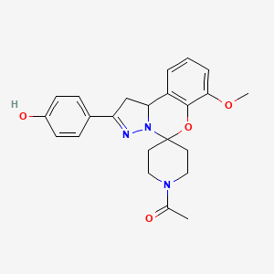 1-(2-(4-Hydroxyphenyl)-7-methoxy-1,10b-dihydrospiro[benzo[e]pyrazolo[1,5-c][1,3]oxazine-5,4’-piperidin]-1’-yl)ethanone is involved in several metabolic pathways. It interacts with enzymes and cofactors that facilitate its biotransformation and elimination from the body. The compound’s metabolism may involve phase I and phase II reactions, including oxidation, reduction, and conjugation, leading to the formation of metabolites that are excreted via renal and hepatic pathways. These metabolic processes can influence the compound’s bioavailability and therapeutic efficacy.